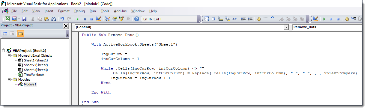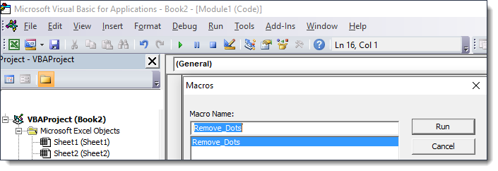 4. בסרגל הכלים נלחץ על לחצן הפעלת קוד מקרו (משולש ירוק) ובחלונית שנפתחת נבחר במקרו Remove_Dots ונלחץ על Run.