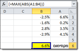 יש להקליד את הנוסחה MAX(ABS(A1:B4)) = ולאחר מכן ללחוץ בו זמנית על CTRL + ALT + SHIFT.