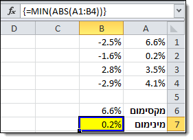 3. בתא B7 נחשב את הערך המינימילי מבין הערכים המוחלטים על ידי הנוסחת המערך הבאה: