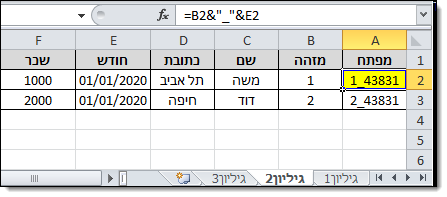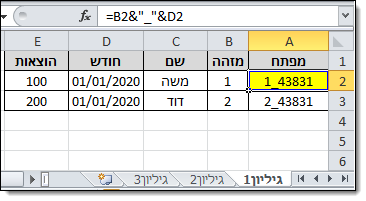 נגדיר בתא A2 את הנוסחה B2 &"_" & D2 ונעתיק אותה לשאר התאים בעמודה A.