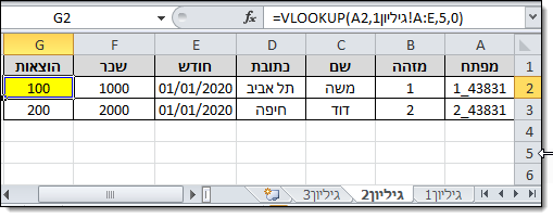 =VLOOKUP(A2,גיליון1!A:E,5,0)
