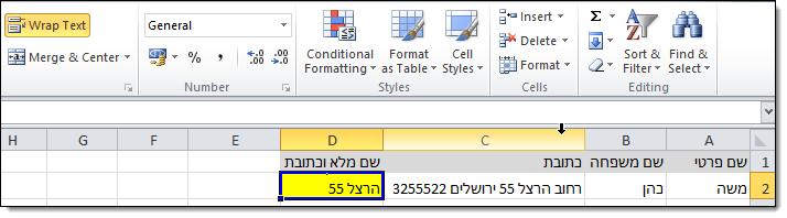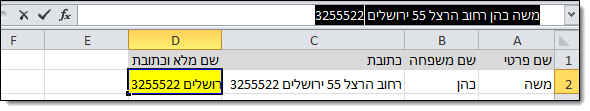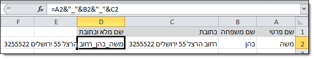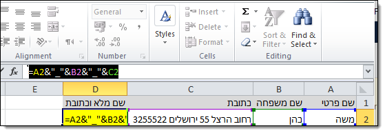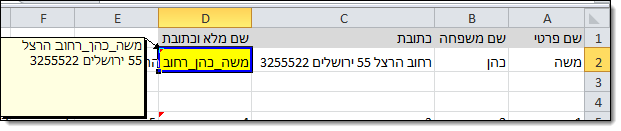 1. נניח קיימת באקסל טבלה המכילה את הנתונים הבאים: שם פרטי, שם משפחה, כתובת ועמודה נוספת המכילה שרשור של ערכי השם והכתובת.