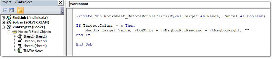נבצע שימוש בקוד VBA כך שבלחיצה כפולה על תא בעמודה D, אקסל יציג את הערך של התא בתיבת הודעה.