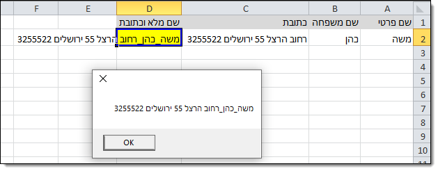 3. התוצאה בלחיצה כפולה על התא D2 היא שמוצגת תיבת הודעה עם השם המלא והכתובת.