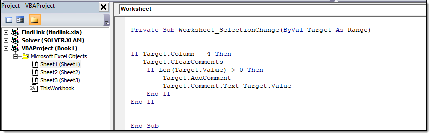 נבצע שימוש בקוד VBA כך שבבחירת תא בעמודה D, אקסל ימיר את ערך התא להערה ויציג אותה.
