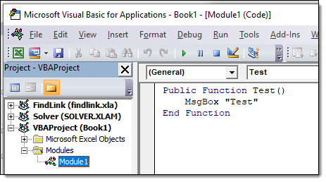 ניתן להגדיר באקסל פונקציה מותאמת אישית ולהפעיל אותה מנוסחה בגיליון.לדוגמא: בעורך VBA נגדיר את הנוסחה הבאה שמציגה תיבת טקסט עם הטקסט Test.