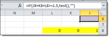 בתא J6 נגדיר את הנוסחה הבאה: IF(J8+K8+L8>=1.5,test(),"") =