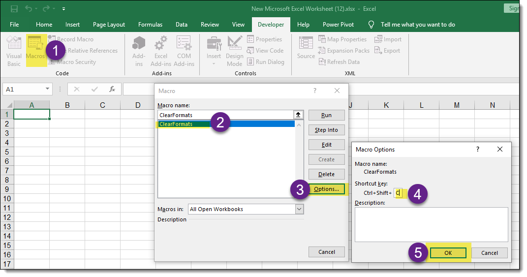 3. נסגור את עורך VBA, נבחר בתפריט Developer -> Macros -> ClearFormats -> Options בתא הגדרת קיצור הדרך נלחץ על Shift + C ואז על OK.