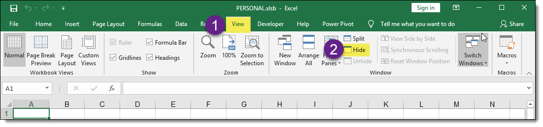 4. בתפריט View יש ללחוץ על Hide על מנת שקובץ האקסל ייפתח מוסתר בכל פעם שנפתח קובץ אקסל במחשב.