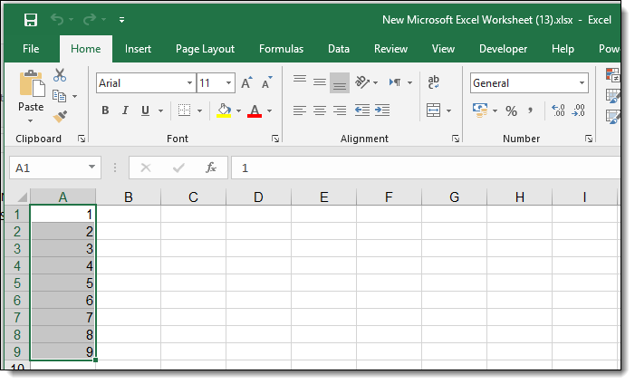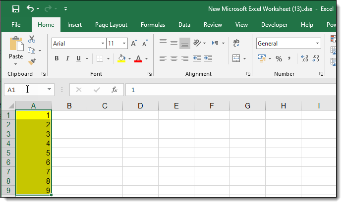6. דוגמה לשימוש - בקובץ אקסל חדש נגדיר את המספרים 1-9 בתארים A1 עד A9 ונשנה את צבע התאים לצהוב.