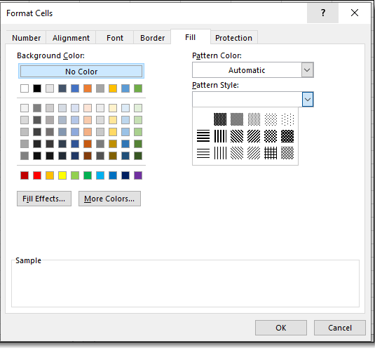 באקסל 365 כאשר מסמנים תא אחד או יותר, לוחצים על הלחצן הימני בעכבר ובוחרים בתפריט "עיצוב תאים" אז בתפריט "מילוי" ניתן להגדיר את צבע המילוי וסגנון הרקע (נקודות וקווים בצפיפות שונה).