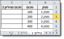 1. בגיליון 1 נגדיר את הטבלה הבאה: ספק, סכום וסכום מגיליון 2.