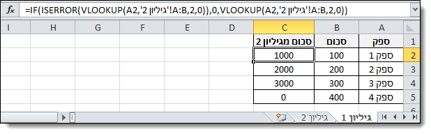 במידה ובגיליון 2 כל ספק יכול להופיע לכל היותר פעם אחת אז נעשה שימוש בפונקציית VLOOKUP שתחזיר את הסכום המתאים לספק אם הוא נמצא בגיליון 2 ותחזיר אפס במידה והספק לא מופיע בגיליון 2.