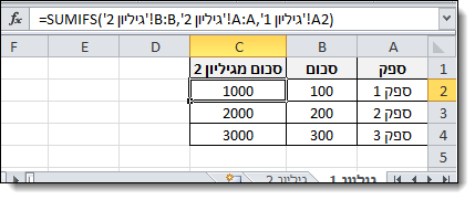 במידה ובגיליון 2 ספק יכול להופיע יותר מפעם אחת אז נעשה שימוש בפונקציה SUMIFS שתחזיר את סך הסכומים לספק מגיליון 2.
