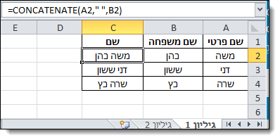 בתא C2 נגדיר את הנוסחה הבאה המחזירה את שרשור השם הפרטי, רווח ושם המשפחה ונעתיק אותה ליתר התאים בעמודה C.