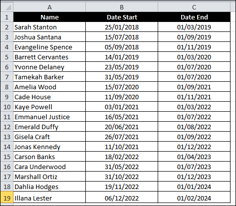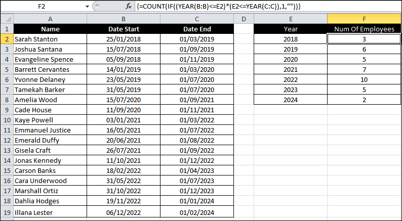 עבור שנת 2018 הנוסחה מונה את מספר השורות בהן תאריך הצטרפות לחברה קטן או שווה ל-2018 ותאריך סיום העבודה בחברה גדול או שווה ל-2018.