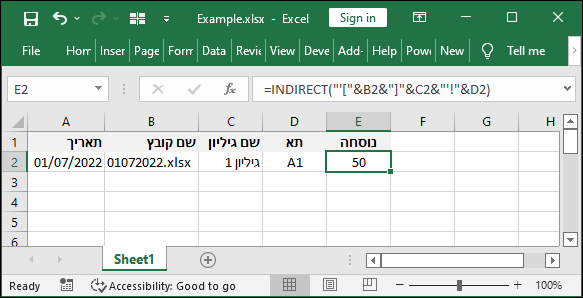 נוסחה - נוסחה שמחזירה את הערך מהקובץ, הגיליון והתא המבוקשים