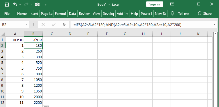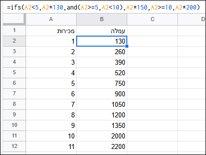 =IFS(A2<5,A2*130,AND(A2>=5,A2<10),A2*150,A2>=10,A2*200)
