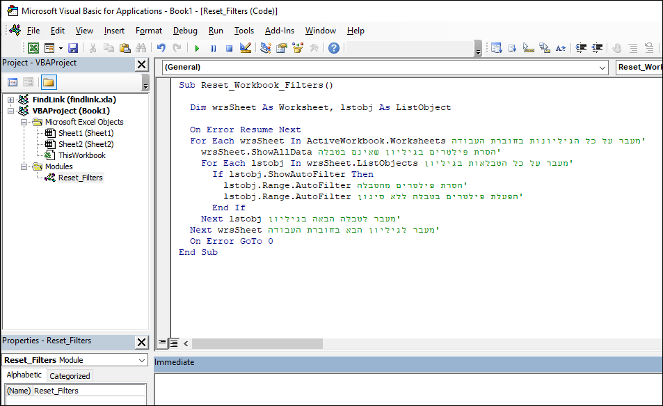 לאחר מכן מבוצע מעבר על כל הטבלאות בגיליון ועבור כל טבלה מוסרים הפילטרים ומופעלים מחדש ללא סינונים.