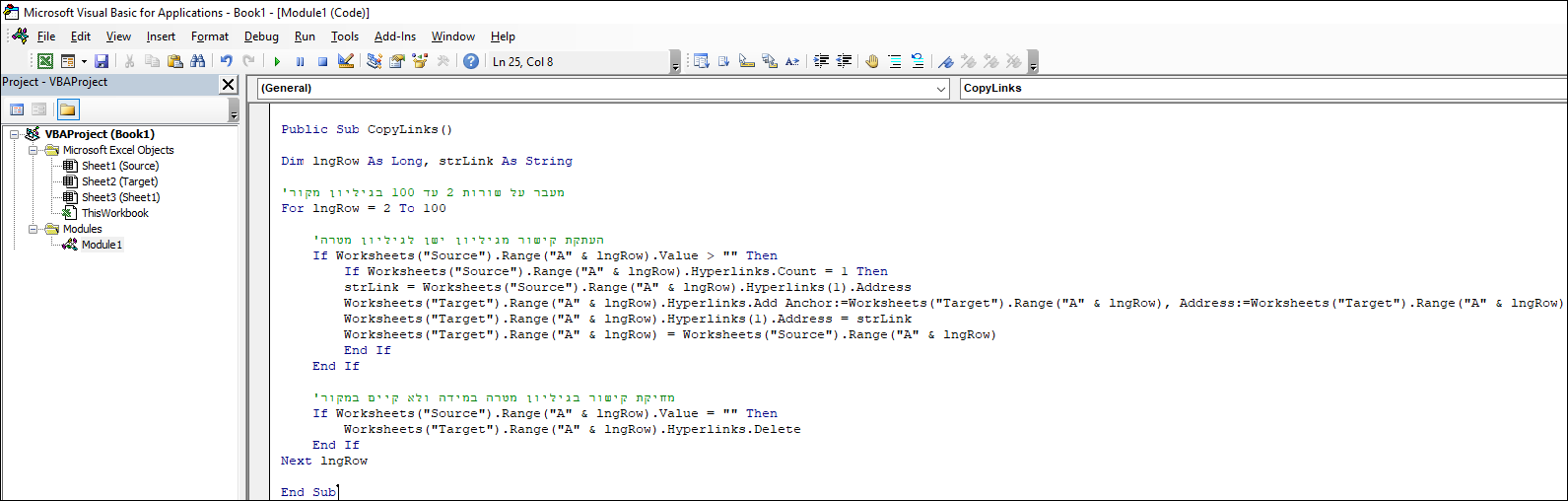 מצ"ב דוגמה לסנכרון רשימת קישורים בין גיליון מקור לגיליון יעד על ידי שימוש בקוד VBA.