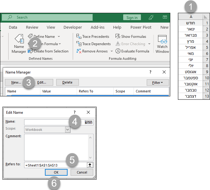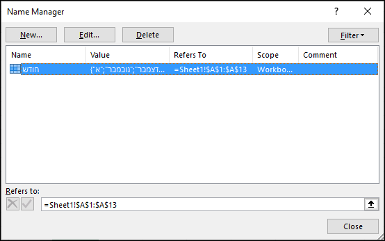 נגדיר באקסל שם חדש בשם חודש על ידי בחירה במנהל השמות -> חדש -> הגדרת שם וטווח (בחירת ערכי החודשים בעמודה A).
