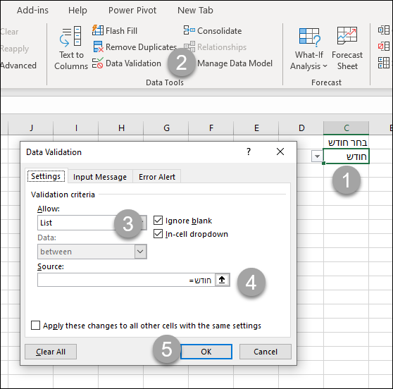 על מנת להגדיר אימות נתונים בתא שיחייב בחירת חודש מרשימה נבחר לדוגמה בתא C2 ואז ב-אימות נתונים -> רשימה List -> וכמקור נתונים נגדיר את השם שהוגדר לפני כן.