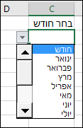 התוצאה היא שבתא C2 תוצג רשימת בחירה של ערכי חודשים. ניתן להגדיר את אימות הנתונים לכל עמודה C באופן דומה (על ידי בחירת העמודה C במקום התא C2)