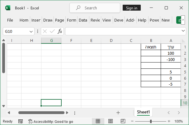 בתאים A2 עד A7 נגדיר ערכים מספריים חיוביים, שליליים, אפס או תא ריק.