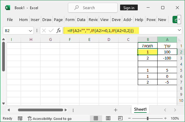 אחרת - נבדק אם הערך בעמודה A הוא חיובי או אפס. אם הערך הוא חיובי או אפס אז הנוסחה מחזירה את הערך 1.