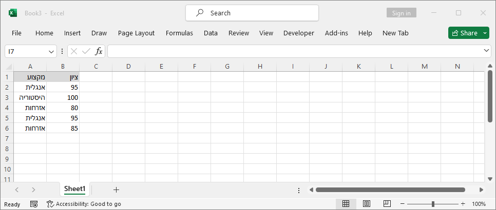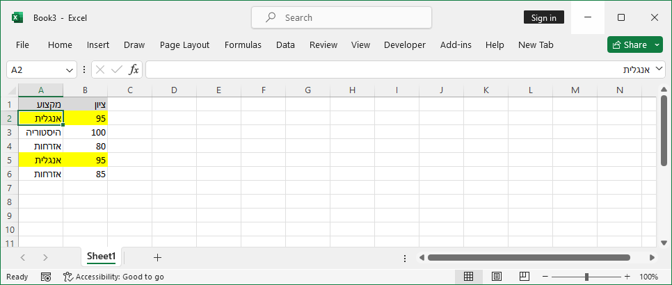בגיליון אקסל נגדיר שתי עמודות - מקצוע וציון.