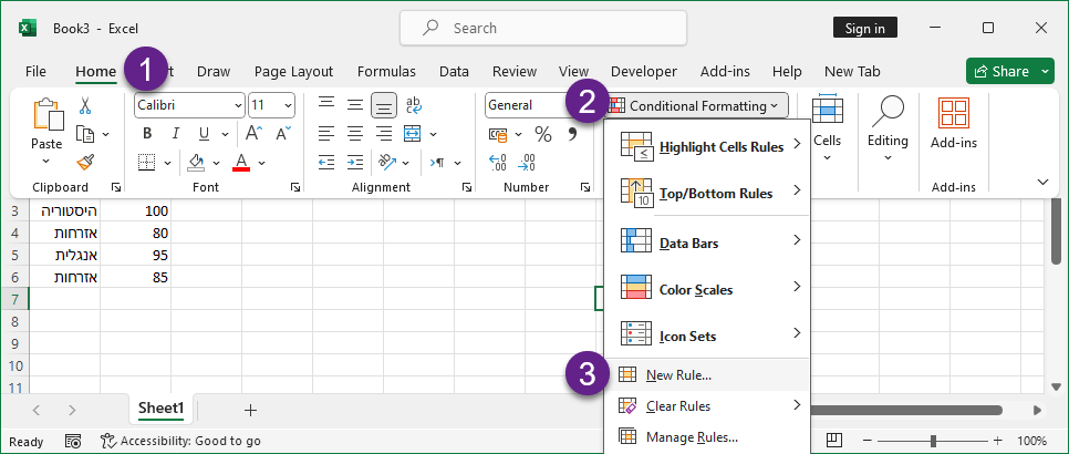 נגדיר כלל עיצוב מותנה חדש על ידי לחיצה על בית -> עיצוב מותנה -> כלל חדש.