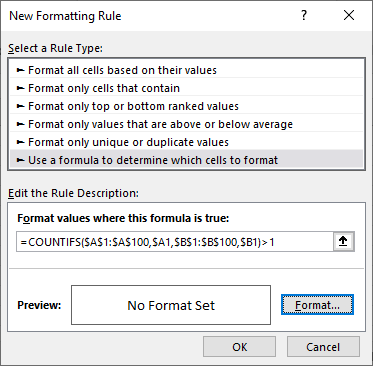 COUNTIFS($A$1:$A$100,A1,$B$1:$B$100,B1)>1=
