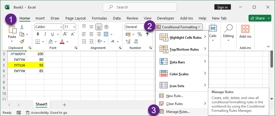 על מנת להחיל את הכלל החדש על עמודות A ו-B נבחר בבית -> עיצוב מותנה -> ניהול כללים.