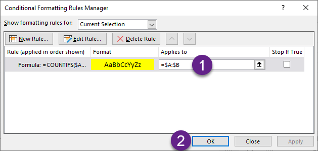 במידה והצירוף נמצא יותר מפעם אחת הנוסחה מחזירה ערך אמת והמשמעות היא שהכלל מתקיים ולכן התאים מעוצבים בהתאם לעיצוב המותנה.