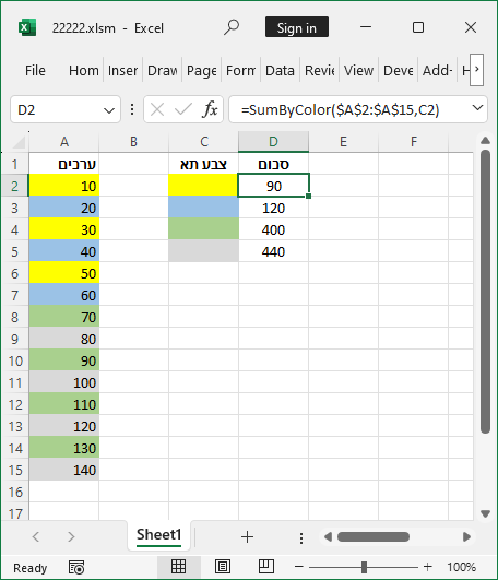 בתא D2 נגדיר את הנוסחה הבאה SumByColor($A$2:$A$15,C2)