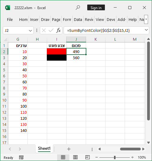 בתא J2 נגדיר את הנוסחה הבאה SumByFontColor($G$2:$G$15,I2)