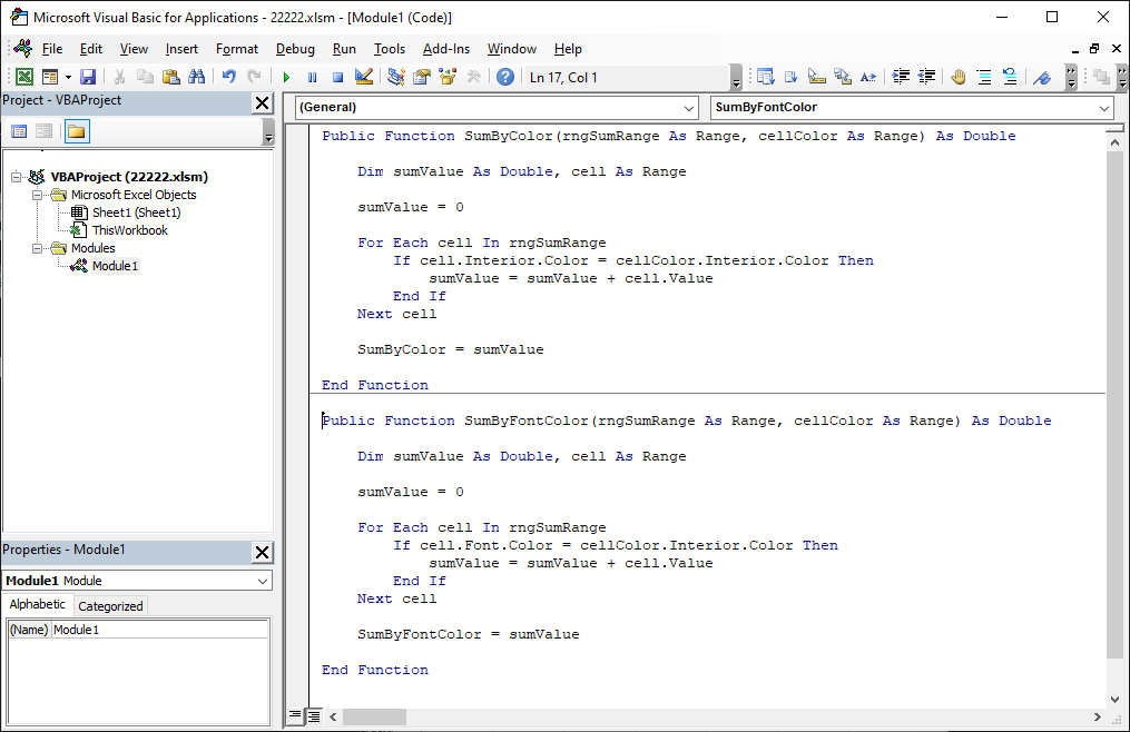 נעתיק את הקוד של הפונקציות SumByColor ו-SumByFontColor.