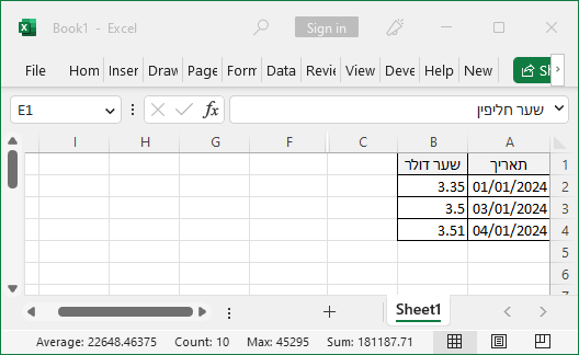 בגיליון אקסל נגדיר טבלת שערי חליפין הכוללת עמודת תאריך ועמודת שער דולר.