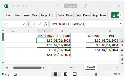 פונקציית Vlookup של אקסל מחפשת את תאריך העסקה המופיע בתא D2 בעמודה A ומחזירה את שער הדולר המתאים מעמודה B.