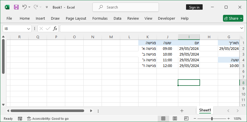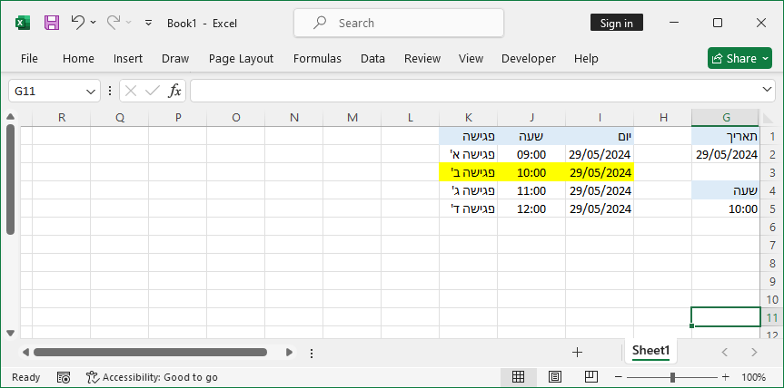 הנוסחה שבא נשתמש כעת תבדוק התאמה של תאריך ושעה בין טבלת הפגישות לתאריך ולשעה שהוגדרו