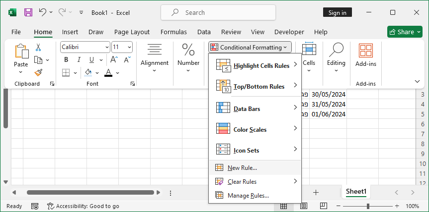 נסמן את התא C1 ובתפריט בית נבחר ב-"עיצוב מותנה" ו-"כלל חדש"