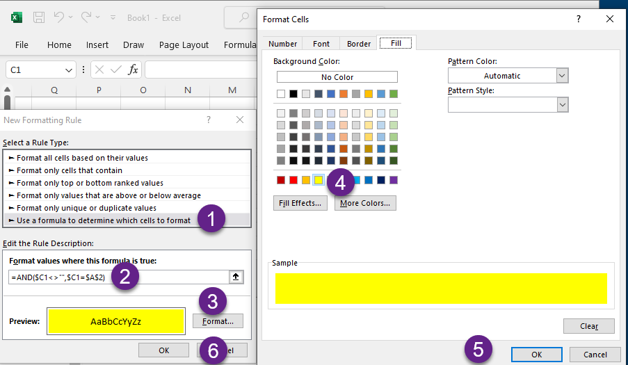 נבחר ב-"השתמש בנוסחה לעיצוב תאים" ונגדיר את הנוסחה הבאה: AND($C1<>"",$C1=$A$2) =