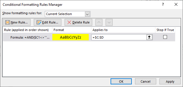 לאחר אישור יוצג הכלל החדש. נגדיר את הטווח אליו הכלל מתייחס לעמודות C ו-D ונלחץ על אישור לסיום.