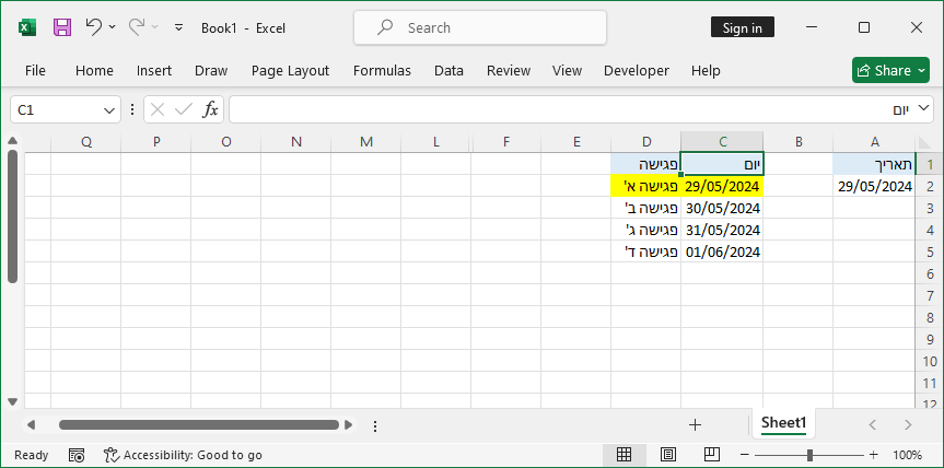 בתא G2 נגדיר תאריך מבוקש לדוגמה ע"י שימוש בפונקציה ()Today