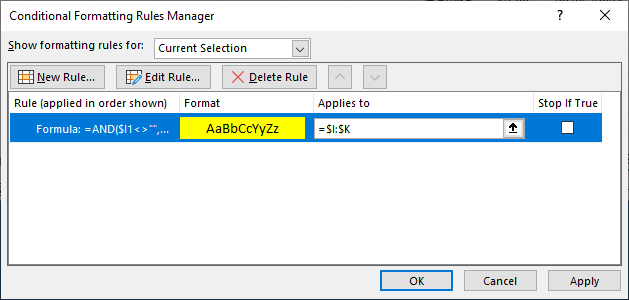 נגדיר את הטווח אליו הכלל מתייחס לעמודות I עד K ונלחץ על אישור לסיום.