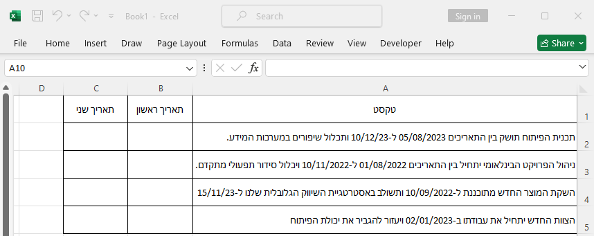 בגיליון אקסל נגדיר עמודה עם ערכי טקסט המכילים תאריך אחד או שני תאריכים בתבנית קצרה או מלאה.