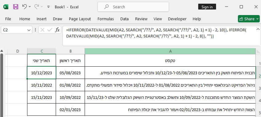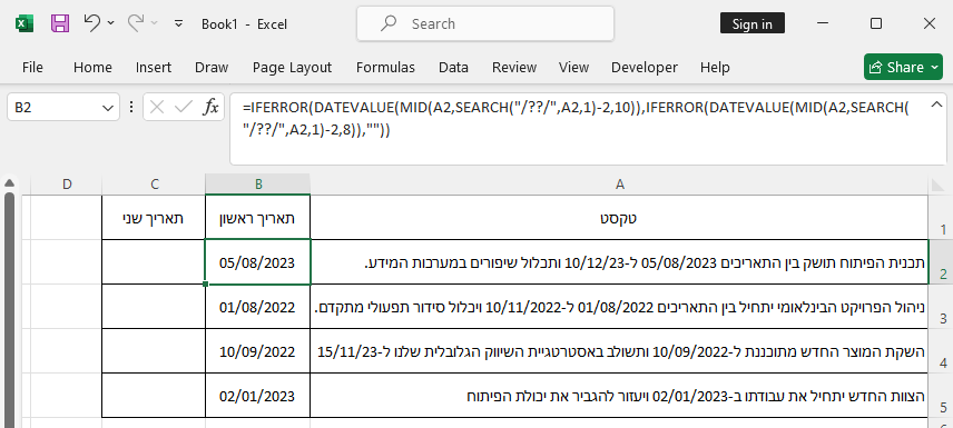 אם נמצא אז המשך הנוסחה הוא בדומה לנוסחה לחילוץ התאריך הראשון (כולל התייחסות לתאריך בפורמט קצר או ארוך).