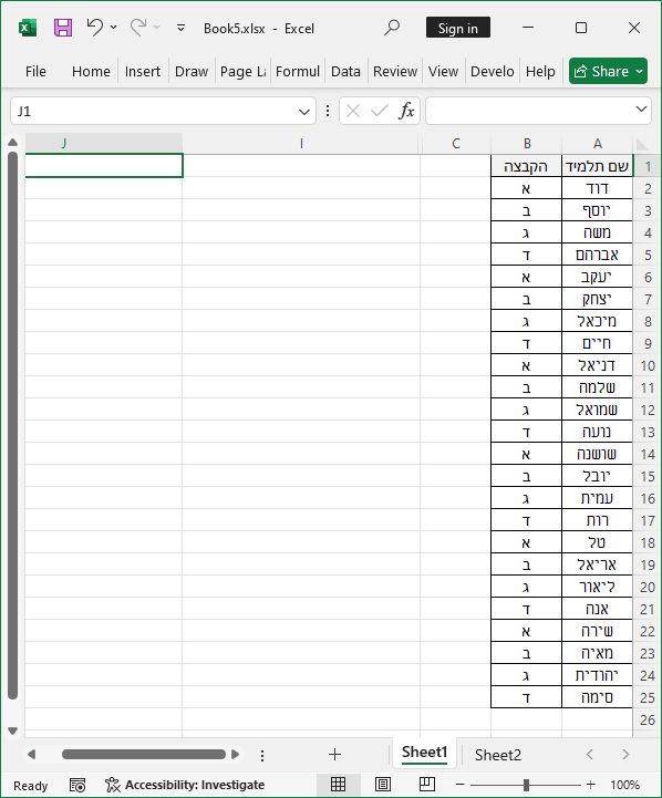 בגיליון אקסל נגדיר בעמודה A את שמות התלמידים ובעמודה B את ההקבצה אליה כל תלמיד משובץ.