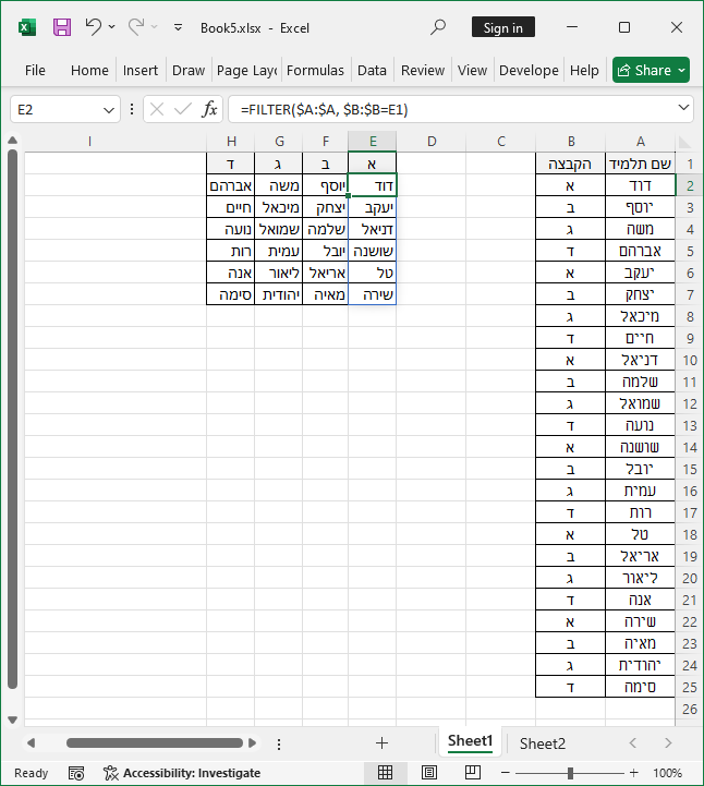 הנוסחה עושה שימוש בפונקציית Filter של אקסל ומסננת את שמות התלמידים מעמודה A עבורם ההקבצה בעמודה B שווה לערך בתא E1.