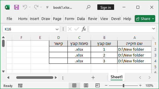בגיליון אקסל נגדיר טבלה הכוללת את העמודות: שם תיקייה (נתיב מלא לתיקייה), שם קובץ, סיומת קובץ וקישור.
